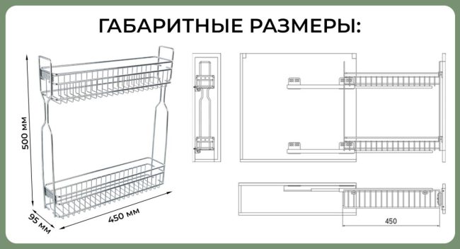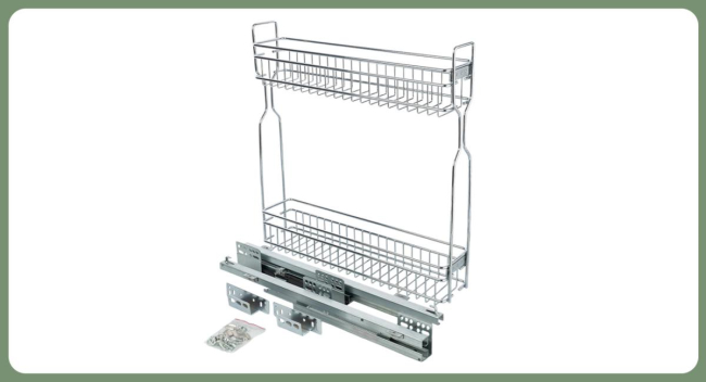 Комплектация: корзина двухуровневая, направляющие скрытого монтажа с механизмом плавного закрывания, крепления к фасаду, крепеж.