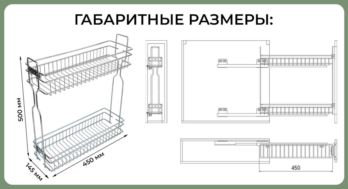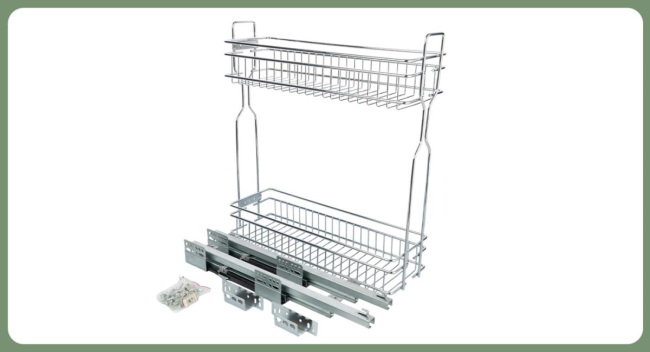 Комплектация: корзина двухуровневая, направляющие скрытого монтажа с механизмом плавного закрывания, крепления к фасаду, крепеж.