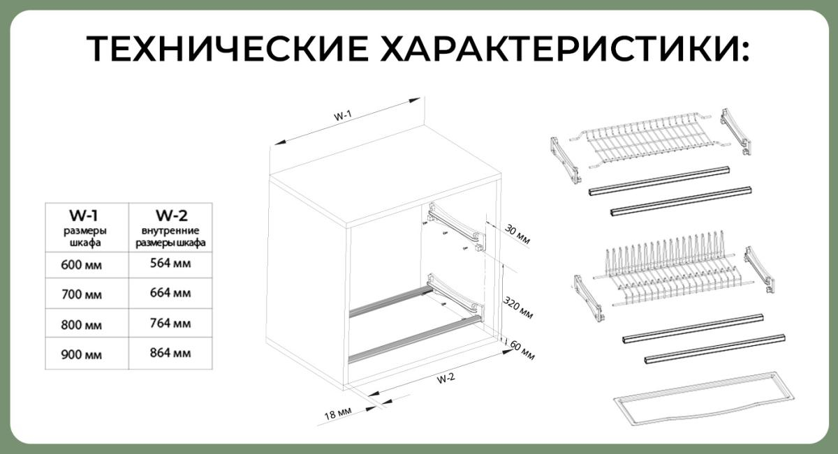 Комплектация: посудосушитель двухуровневый, поддон пластиковый 1 шт, алюминиевые рамки 4 шт, крепления к боковым стенкам 4 шт.