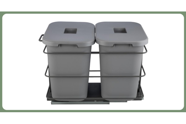 Комплектация: 2 пластиковых контейнера (2*15л) с крышками и фиксаторами пакета, металлическая рама с ручкой, направляющие нижнего монтажа с доводчиком.
