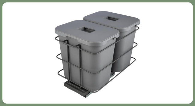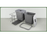 Комплектация: 2 пластиковых контейнера (2*15л) с крышками и фиксаторами пакета, металлическая рама с ручкой, направляющие нижнего монтажа с доводчиком.