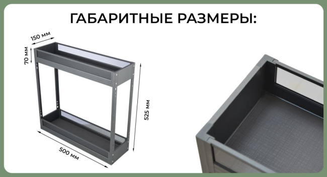 Комплектация: корзина с противоскользящим покрытием, направляющие нижнего монтажа с доводчиком, стабилизаторы устойчивости, крепеж.