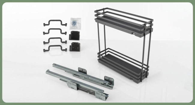 Комплектация: корзина с противоскользящим покрытием, направляющие скрытого монтажа с доводчиком ( установка по диагонали), крепление к фасаду; 4 шт разделители