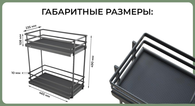 Комплектация: корзина с противоскользящим покрытием, направляющие скрытого монтажа с доводчиком ( установка по диагонали), крепление к фасаду.