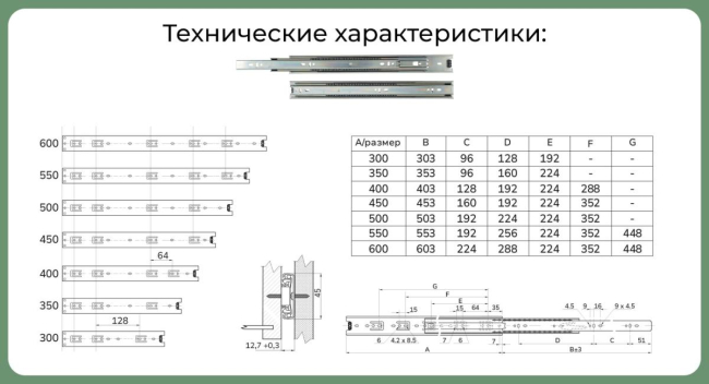 Доп. информация: шариковый подшипник; телескопическая структура; резиновый фиксатор, препятствующий самопроизвольному открыванию. Возможность разбора направляющей для удобного монтажа