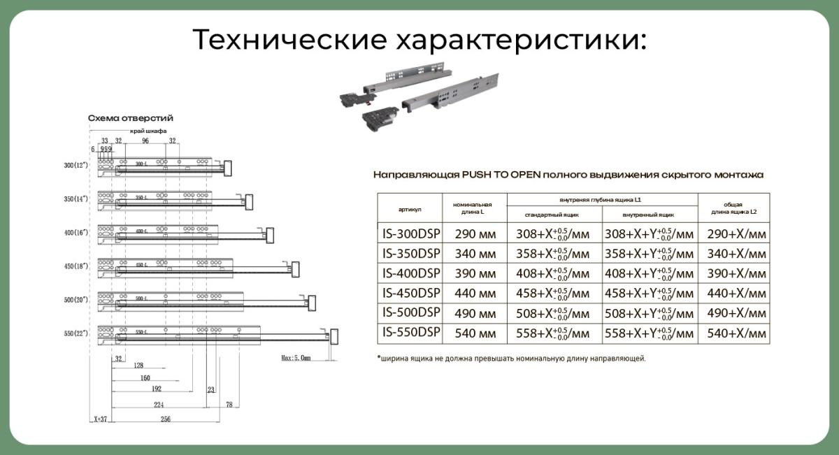 Наименование: SETE Направляющая PUSH TO OPEN скрытого монтажа, 3D , SLIDESET L350, сталь, 10шт/кор IS-350DSP