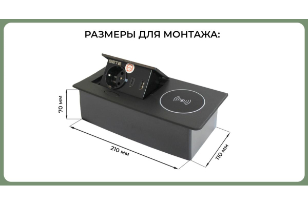 Наименование: SETE Встраиваемый удлинитель,1 гнездо, 1USB,1 type C, беспров. зарядка, черный 9шт/кор SBT-1UCWT-20