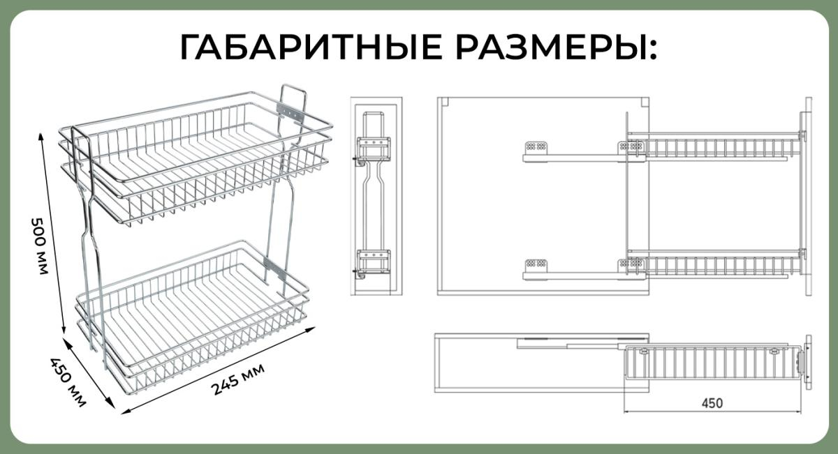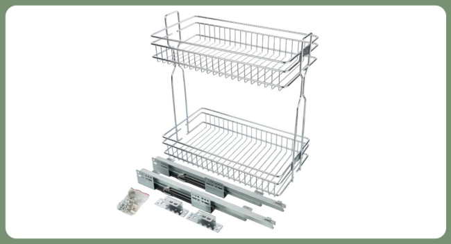 Комплектация: корзина двухуровневая, направляющие скрытого монтажа с механизмом плавного закрывания, крепления к фасаду, крепеж.