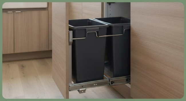 Комплектация: 2 пластиковых контейнера (2*15л), металлическая рама с креплением к фасаду, нижний монтаж, направляющие шариковые с доводчиком.