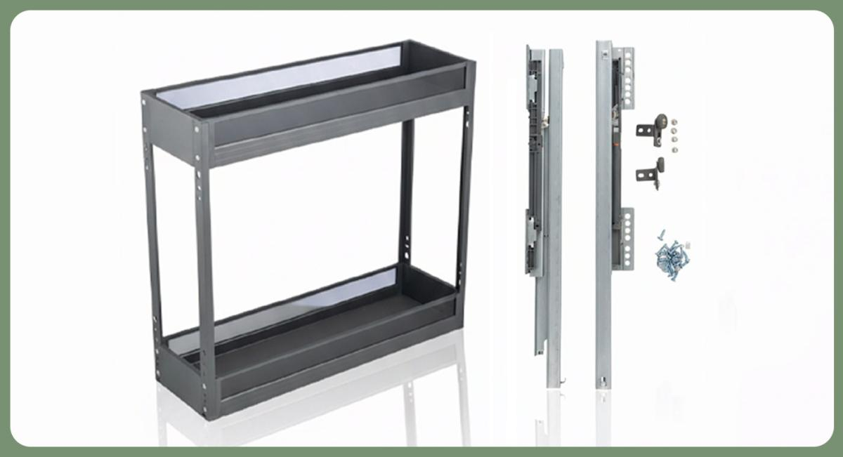 Комплектация: корзина с противоскользящим покрытием, направляющие нижнего монтажа с доводчиком, стабилизаторы устойчивости, крепеж.