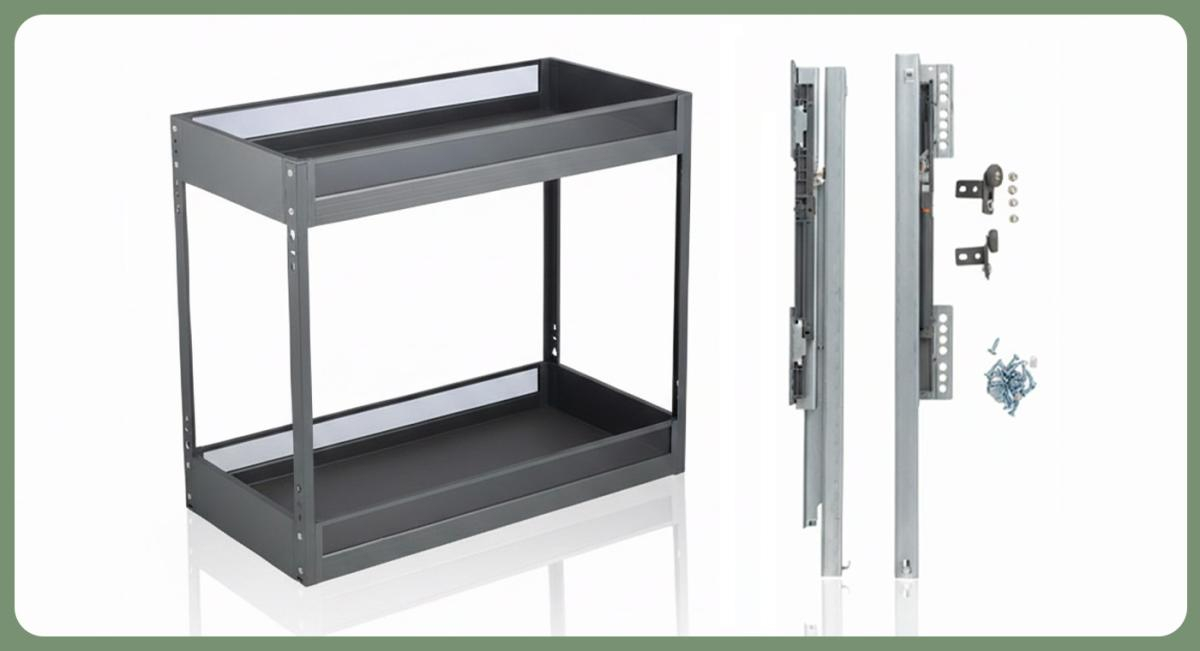 Комплектация: корзина с противоскользящим покрытием, направляющие нижнего монтажа с доводчиком,стабилизаторы устойчивости, крепеж.