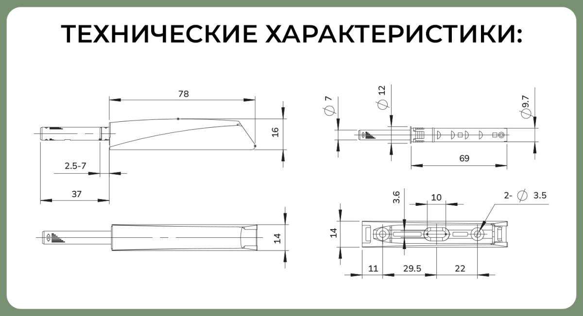 Примечание: SETE Толкатель (отбойник) c силиконовым окончанием с накладным типом монтажа предназначен для распашных дверей и ящиков без доводчиков.