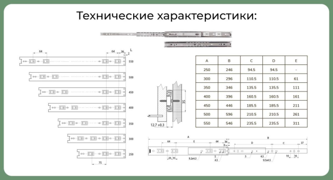 Доп. информация: шариковый подшипник; телескопическая структура; резиновый фиксатор, препятствующий самопроизвольному открыванию. Возможность разбора направляющей для удобного монтажа