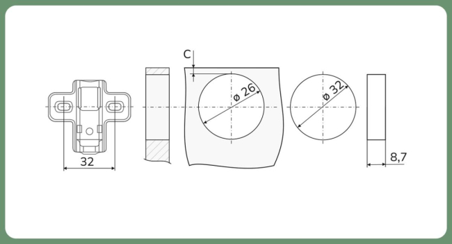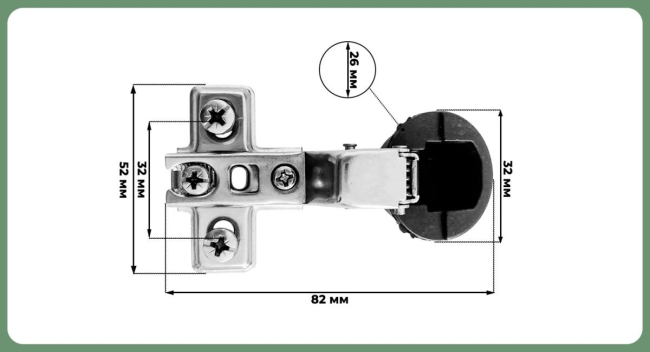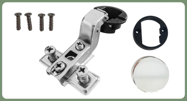 Комплектация: петля с ответной планкой,еврошурупы, крепежное пластмассовое кольцо, декоративная заглушка круглая хром, винты