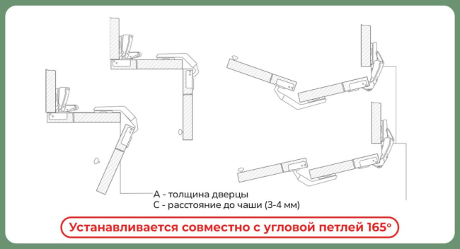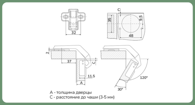 - Угол открывания: 120