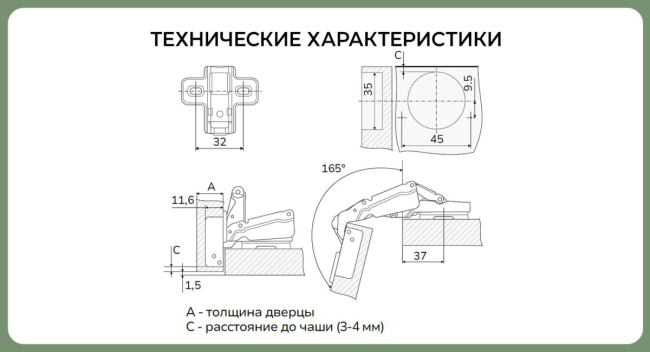 - Угол открывания: 165
