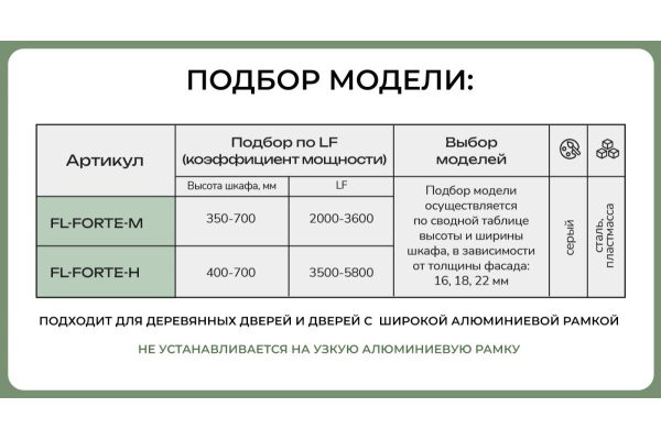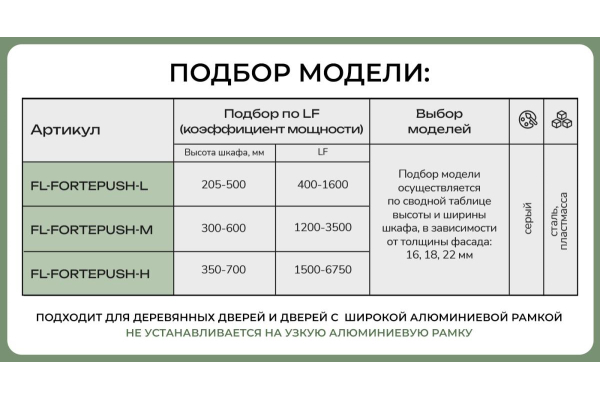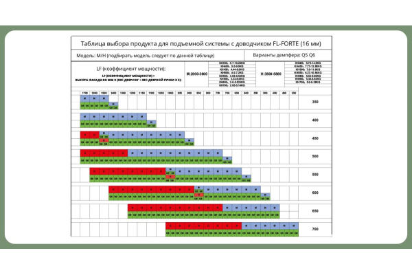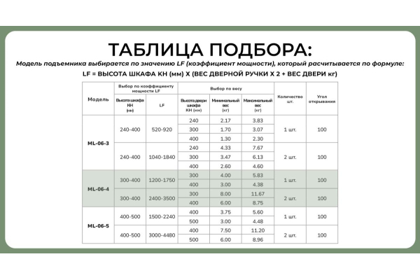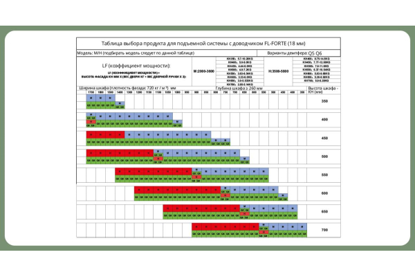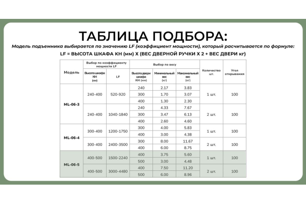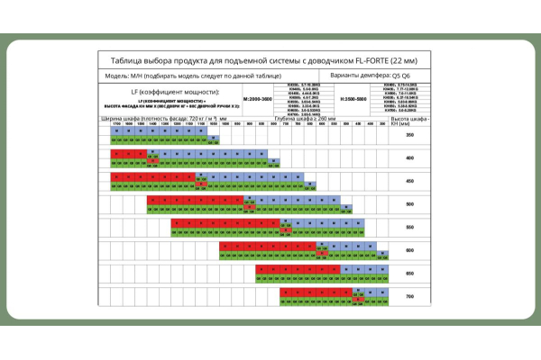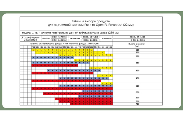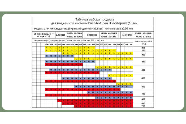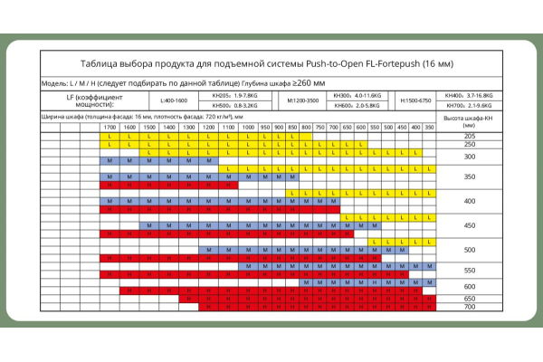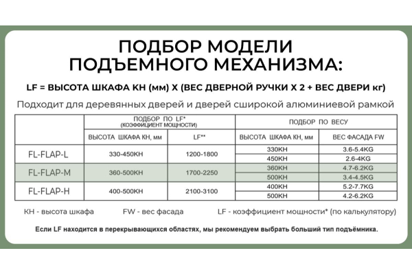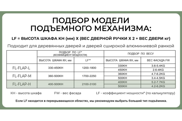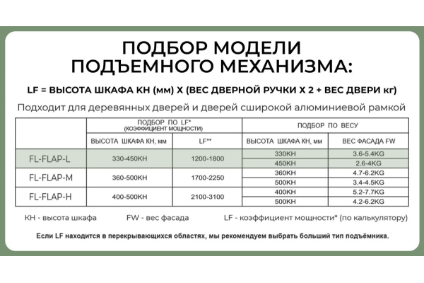 Доп. информация: модель подъемника выбираем по сводной таблице ширины и высоты шкафа в зависимости от толщины фасада 16мм, 18мм, 22мм, а так же можно использовать формулу расчета LF- коэффициенту мощности.