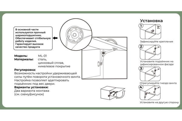 Доп. информация: Возможность настройки под различный вес фасада, путем поворота винта в середине рычага, для установки правильного давления трения.