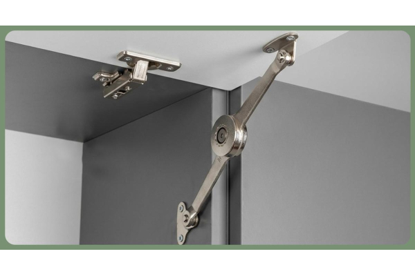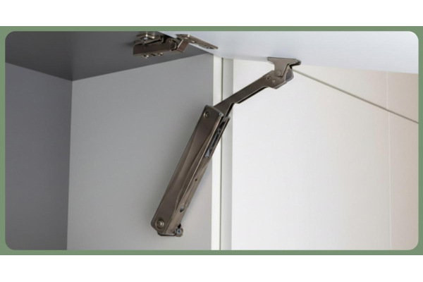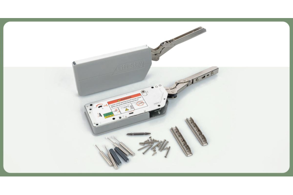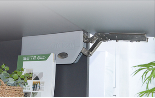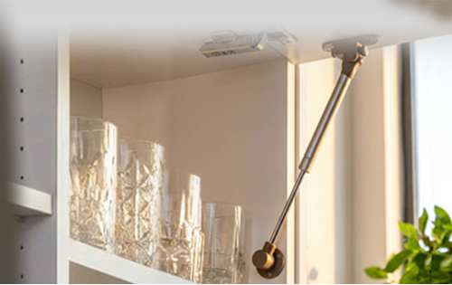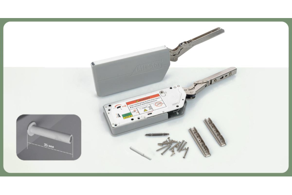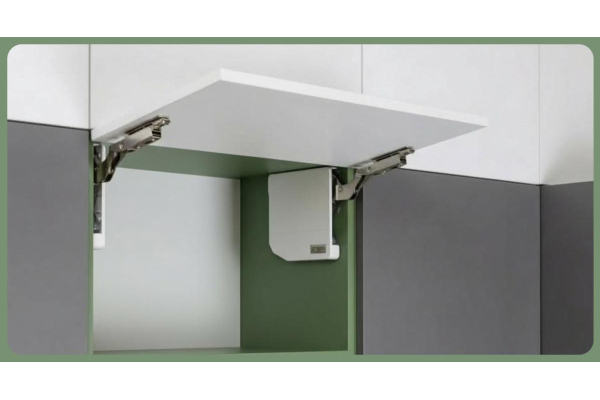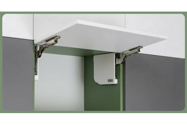 Данный подъемный поворотный механизм устанавливается без петель и подходит для деревянных фасадов, а также фасадов с широкой алюминиевой рамкой.