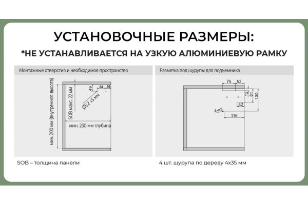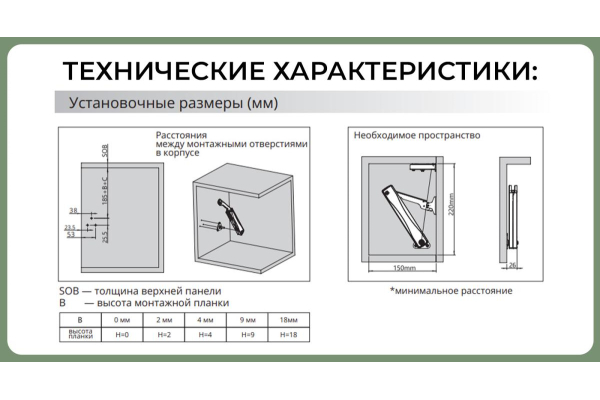 Доп. информация: модель подъемника выбираем по сводной таблице ширины и высоты шкафа в зависимости от толщины фасада 16мм, 18мм, 22мм. В зависимости от ширины шкафа укорачиваем поперечную штангу, рассчитывая необходимую длину по формуле ( см. инструкцию).