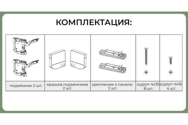 Комплектация: силовой механизм 2шт; заглушка левая/правая 2 шт; крепление к фасаду 2шт.; демпферы 3 шт.