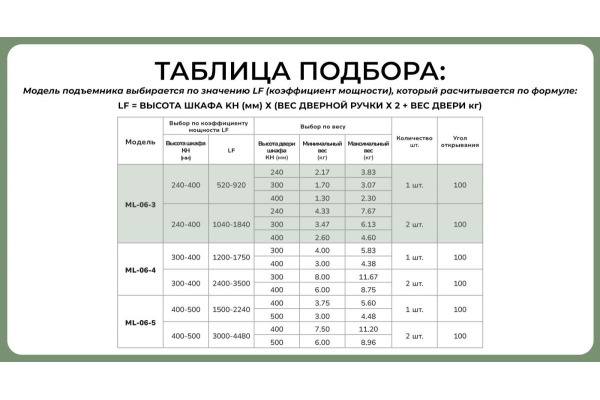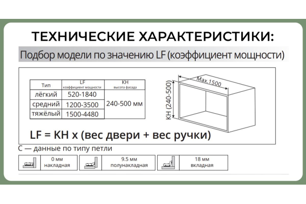 Модель подъемника выбираем по значению LF (коэффициент мощности.) Крепление( адаптер ML-AF-07) для установки на фасады с узкой алюминиевой рамкой приобретаются отдельно.В наличии- Артикул: ML-06-4-07