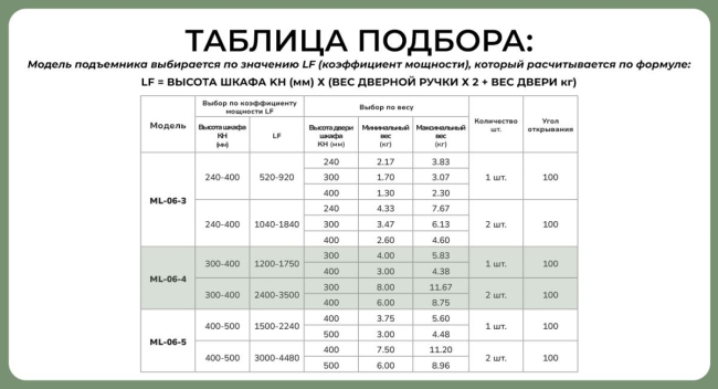 Модель подъемника выбираем по значению LF (коэффициент мощности.) Крепление( адаптер ML-AF-07) для установки на фасады с узкой алюминиевой рамкой приобретаются отдельно.