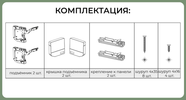 Комплектация: силовой механизм -2шт; заглушка левая/правая 2 шт; крепления к фасаду 2 шт.