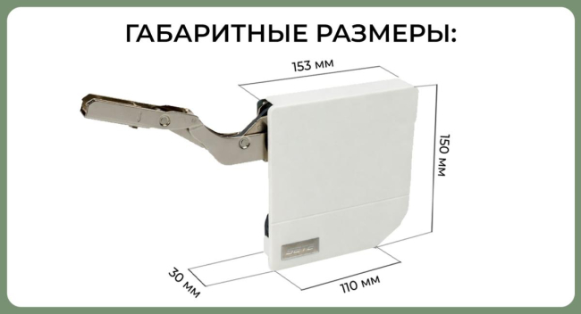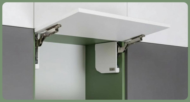 Данный подъемный поворотный механизм устанавливается без петель и подходит для деревянных фасадов, а также фасадов с широкой алюминиевой рамкой.