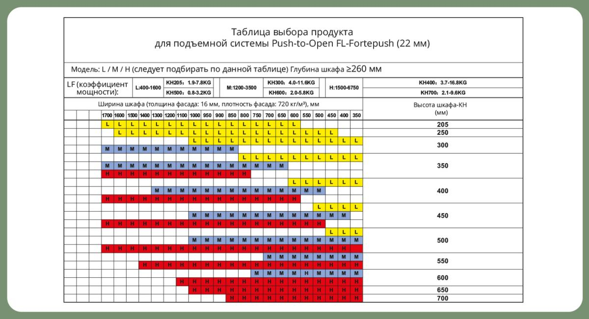 Доп. информация: модель подъемника выбираем по сводной таблице ширины и высоты шкафа в зависимости от толщины фасада 16мм, 18мм, 22мм, а так же можно использовать формулу расчета LF- коэффициенту мощности.