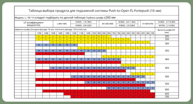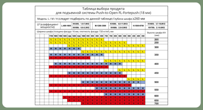 Доп. информация: модель подъемника выбираем по сводной таблице ширины и высоты шкафа в зависимости от толщины фасада 16мм, 18мм, 22мм, а так же можно использовать формулу расчета LF- коэффициенту мощности.