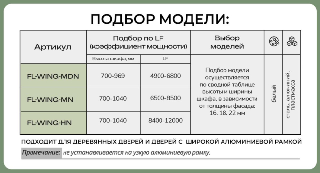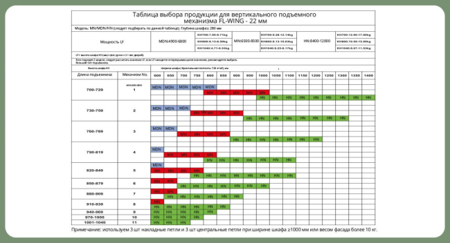 Доп. информация: модель подъемника выбираем по сводной таблице ширины и высоты шкафа в зависимости от толщины фасада 16мм, 18мм, 22мм. Если подходят 2 модели, следует рассчитать значению LF (использовать формулу расчета), если LF находится в перекрывающих значениях, рекомендуется выбрать больший тип подъемника.