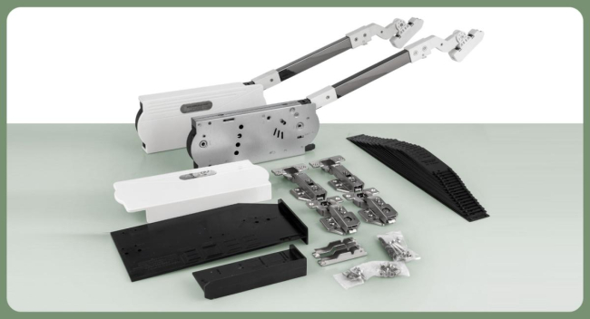 Комплектация: силовой механизм 2шт; заглушка левая/правая 2 шт; крепление к фасаду 2шт; петля накладная 2шт; петля центральная 2 шт