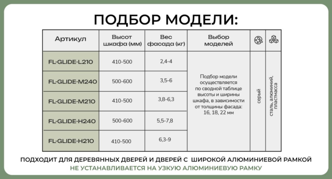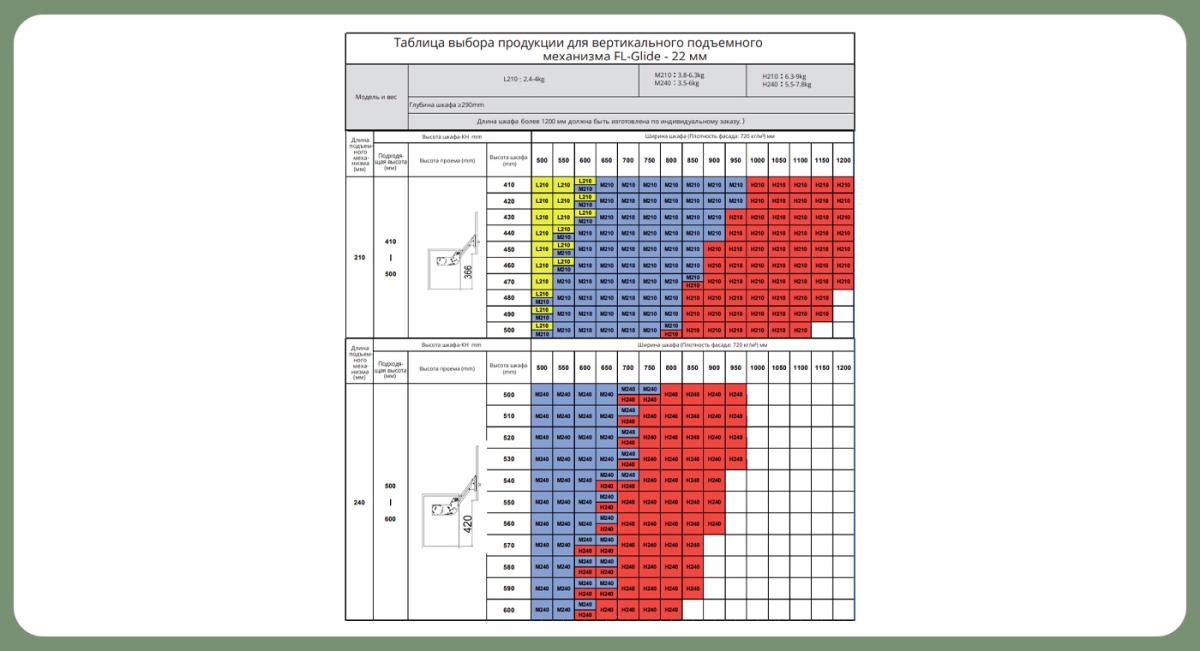 Доп. информация: модель подъемника выбираем по сводной таблице ширины и высоты шкафа в зависимости от толщины фасада 16мм, 18мм, 22мм. В зависимости от ширины шкафа укорачиваем поперечную штангу, рассчитывая необходимую длину по формуле ( см. инструкцию).
