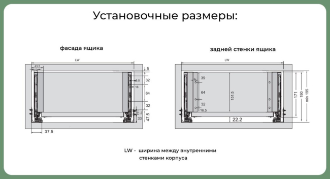- Комплектация: Направляющие, боковые стенки, декоративные заглушки, крепление к фасаду, шурупы