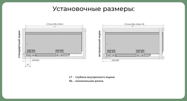 - Комплектация: Направляющие, боковые стенки, декоративные заглушки, крепление к фасаду, шурупы
