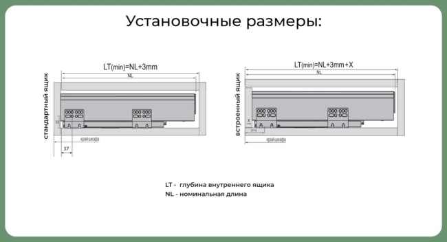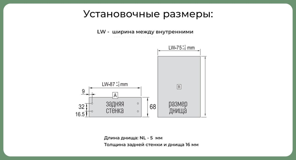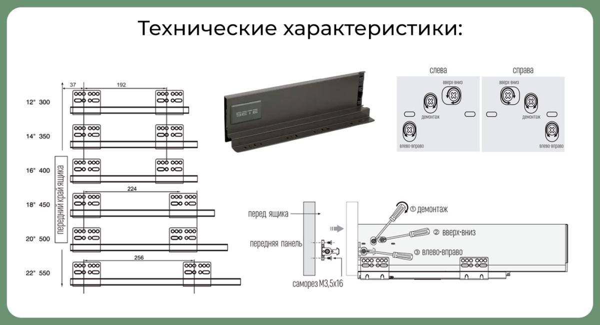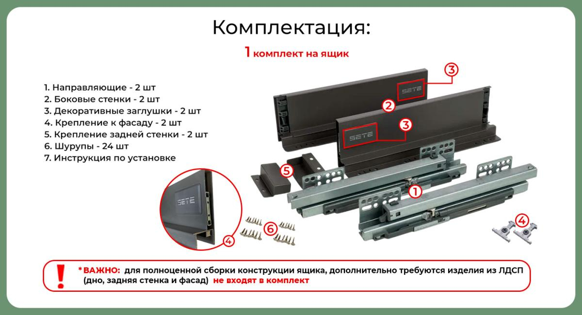 - Комплектация: Направляющие, боковые стенки, декоративные заглушки, крепление к фасаду, шурупы