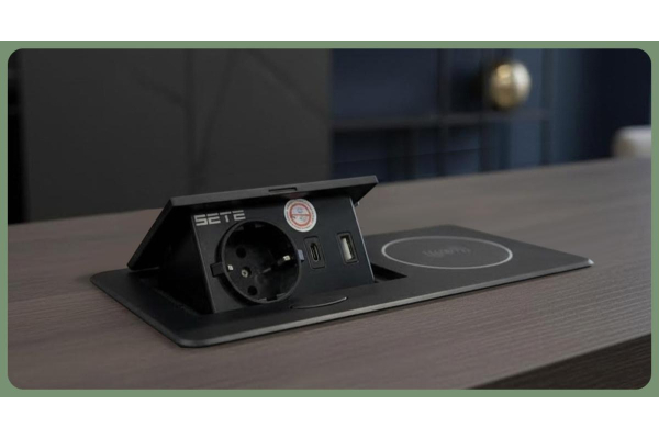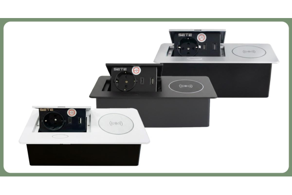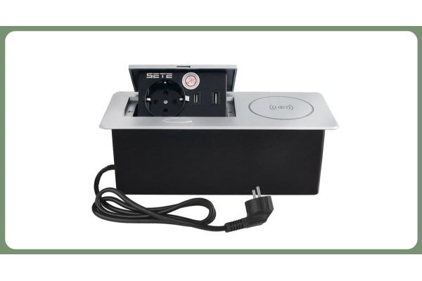 SETE Встраиваемый настольный удлинитель,1 гнездо,2*USB, беспровод.зарядка,черный,9шт/кор SBT-1UCW-20