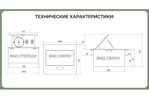 Наименование: SETE Встраиваемый удлинитель,1 гнездо, 1USB, 1 type C, беспров. зарядка, белый 9шт/кор SBT-1UCWT-10