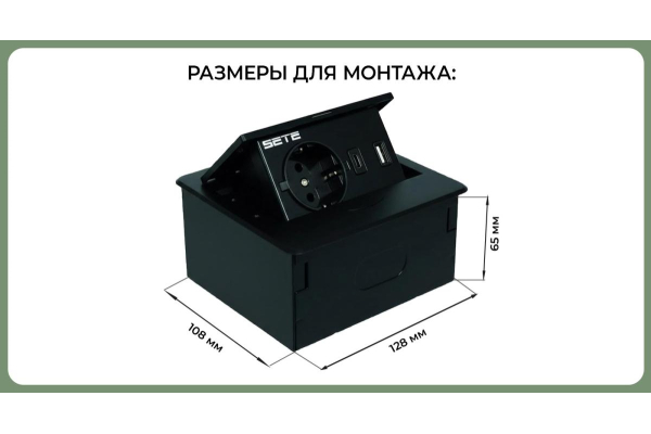 Наименование: SETE Встраиваемый удлинитель, 1 гнездо, 1 USB, 1 type C, с кабелем, черный, 12шт/кор SBT-1UCT-20