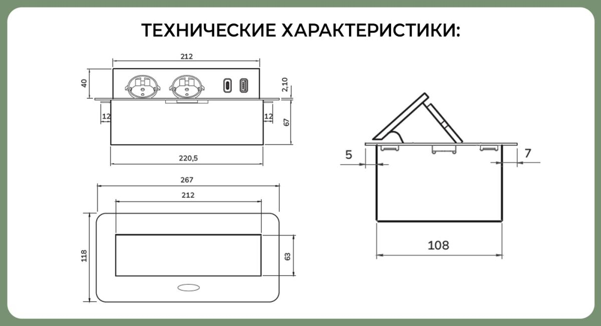 Разъемы: 1 USB 5V 2.1A, 1 type C 2.1A