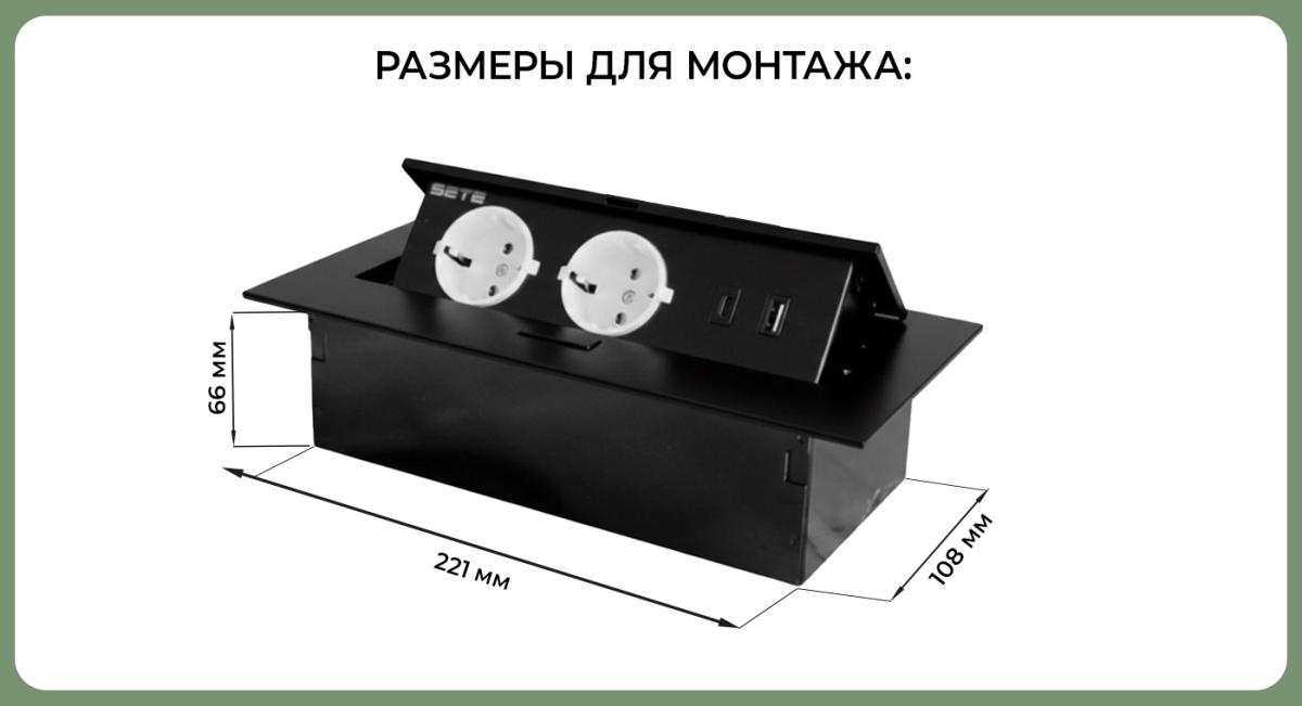 Наименование: SETE Встраиваемый удлинитель, 2 гнезда, 1 USB, 1 type C, с кабелем, черный, SBT-2UCTN-20