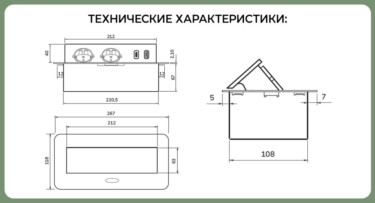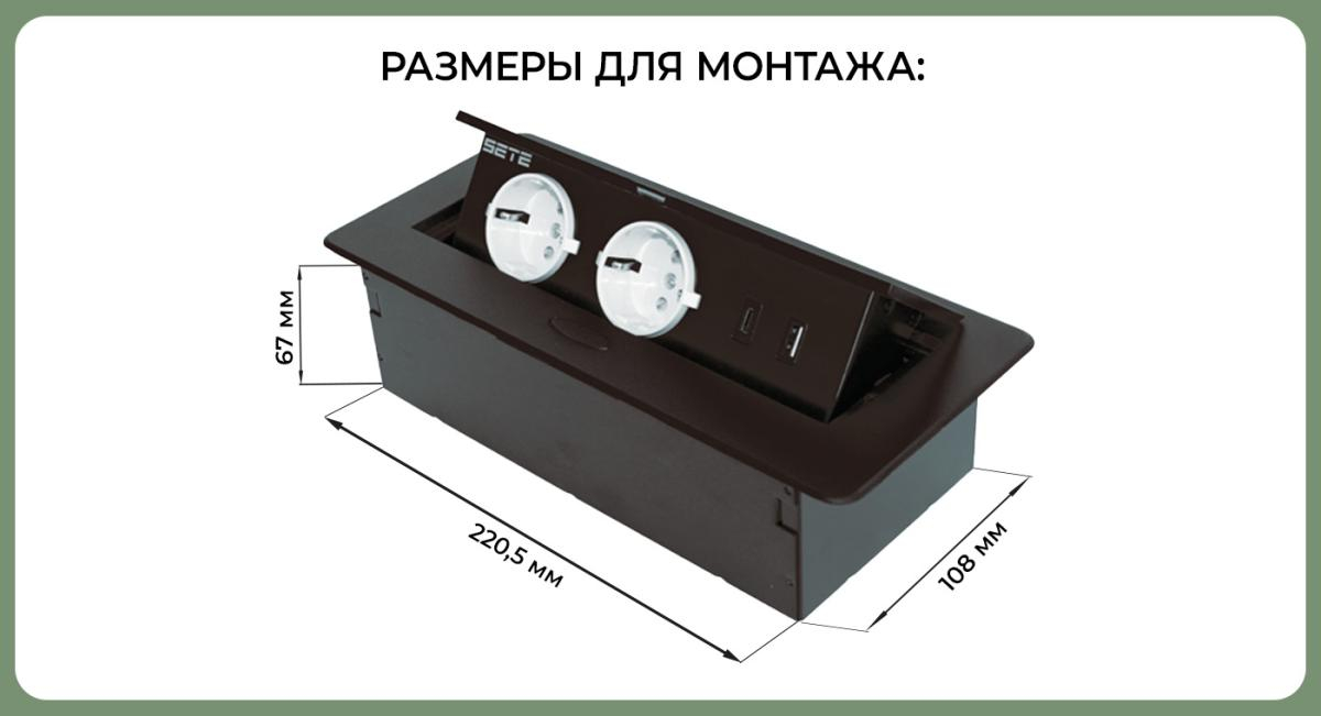 Наименование: SETE Встраиваемый удлинитель, 2 гнезда, 1 USB, 1 type C, с кабелем, черный, SBT-R2UCTN-20