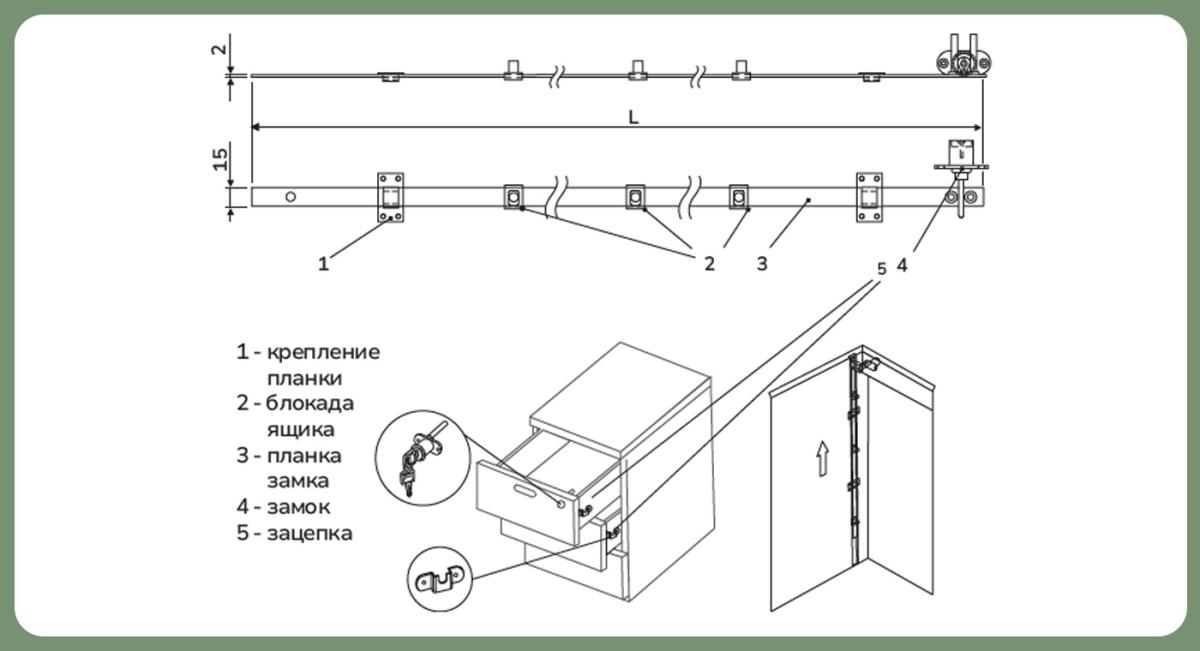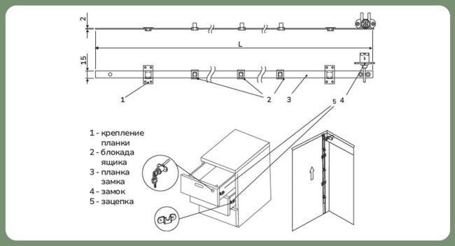 Комплектация: ключ 2 шт., крепление планки 2шт, блокада ящика 3 шт. планка замка 1 шт., зацепка 3 шт.